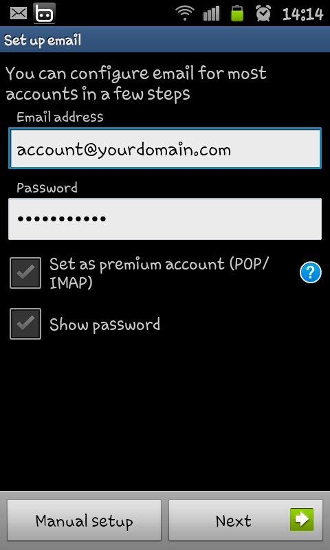 1.1 Email address :ใส่ email account ที่ต้องการเพิ่มลงใน android เช่น This e-mail address is being protected from spambots. You need JavaScript enabled to view it