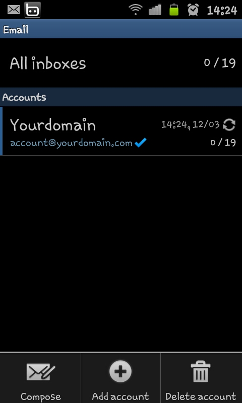 1. ออกจาก inbox ของ mail account แรก โดยแตะที่ชื่อโดเมน จากนั้นไปที่ option > Add account จากนั้นทำตามข้อ 1 (A) จนจบขั้นตอนการเพิ่ม email