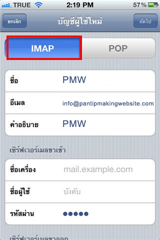 8. ที่หัวข้อ เซิฟเวอร์เมล์ขาเข้า (Incoming Mail Server) ให้ตั้งค่าดังนี้