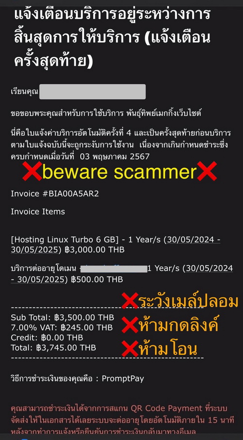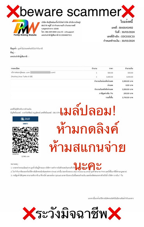 Dear old and current customers of Pantip Making Website Shop, we have been informed from our customers that they’ve gotten fake emails from fraudsters (scammers) reminding them about expiration for their domain and hosting. Scammer intended to register the domain name "pantipwebsite.com" then created an email "info@ pantipwebsite.com" By intending to do similar our name and email for increase credibility. Scammer created the fake invoice and sent emails to our customers. Some customers misunderstand and did not think that it was a scammer's email.